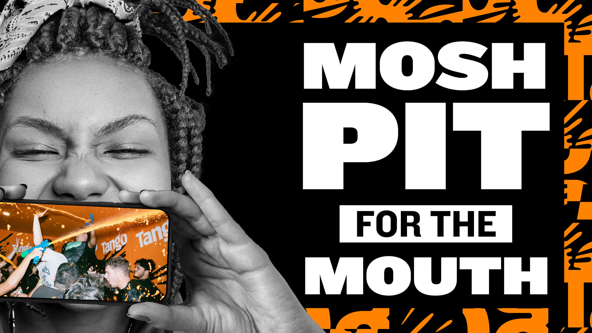 Energetic, spontaneous and up-close lifestyle photography invites you into the action. Dynamic typography collides with breaking frames and clashing colours. The bold tone delivers bursts of high energy refreshment; a springboard for a modernised system whose culturally on-point assets help Tango be part of the conversations that matter.
